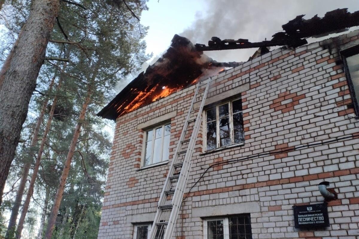 На момент прибытия пожарных отрядов 8-го отряда противопожарной службы области неэксплуатируемом здание Большевишерского лесничества находилось в состоянии горения.