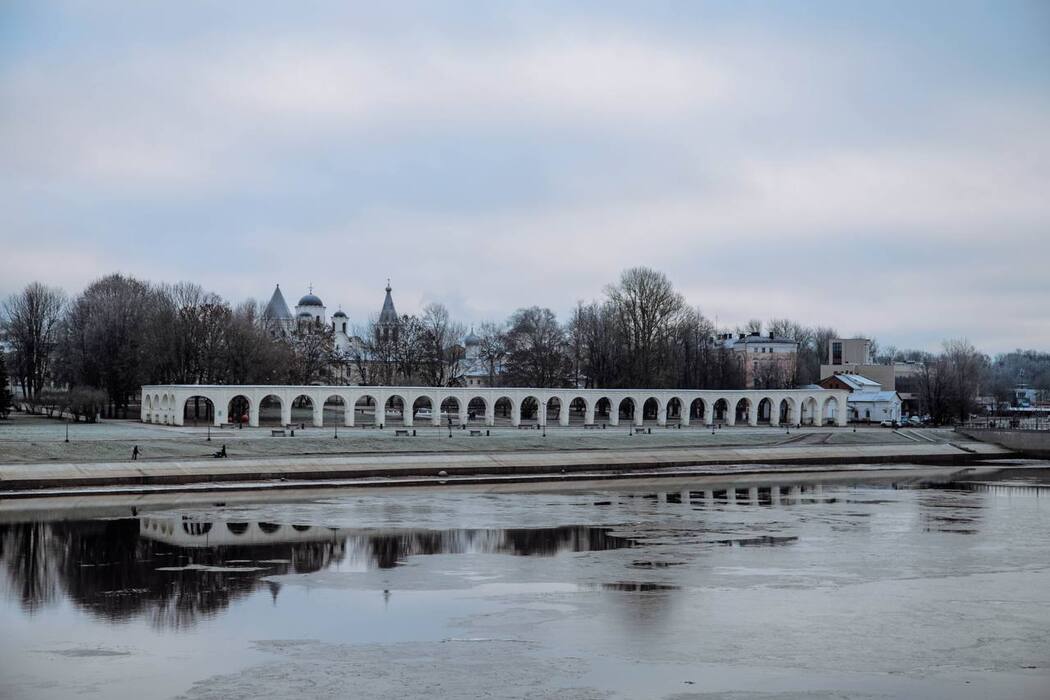 «Морозное утро. Тонкий лёд на воде, спокойная гладь Волхова и белая аркада Гостиного двора — будто вычерченная на фоне зимнего неба», — стоит подпись под фото.