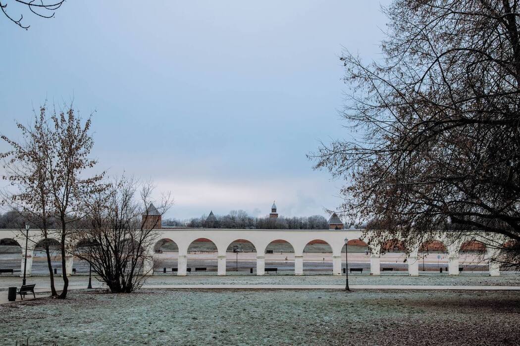 «Морозное утро. Тонкий лёд на воде, спокойная гладь Волхова и белая аркада Гостиного двора — будто вычерченная на фоне зимнего неба», — стоит подпись под фото.