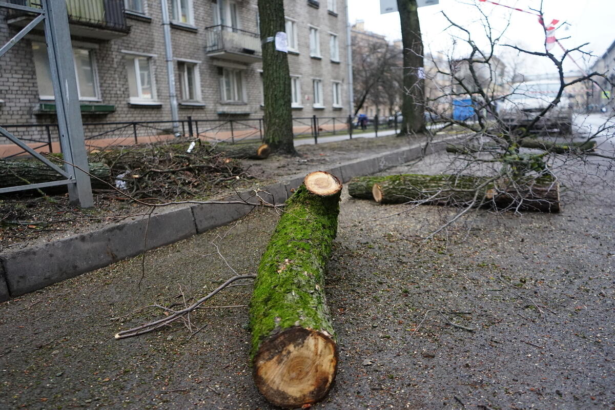 Бригада работников «Городского хозяйства» спилила дерево во дворе многоквартирного, и оно упало на припаркованную иномарку Kia Rio. Фото: Baltphoto/Николай Овсянников