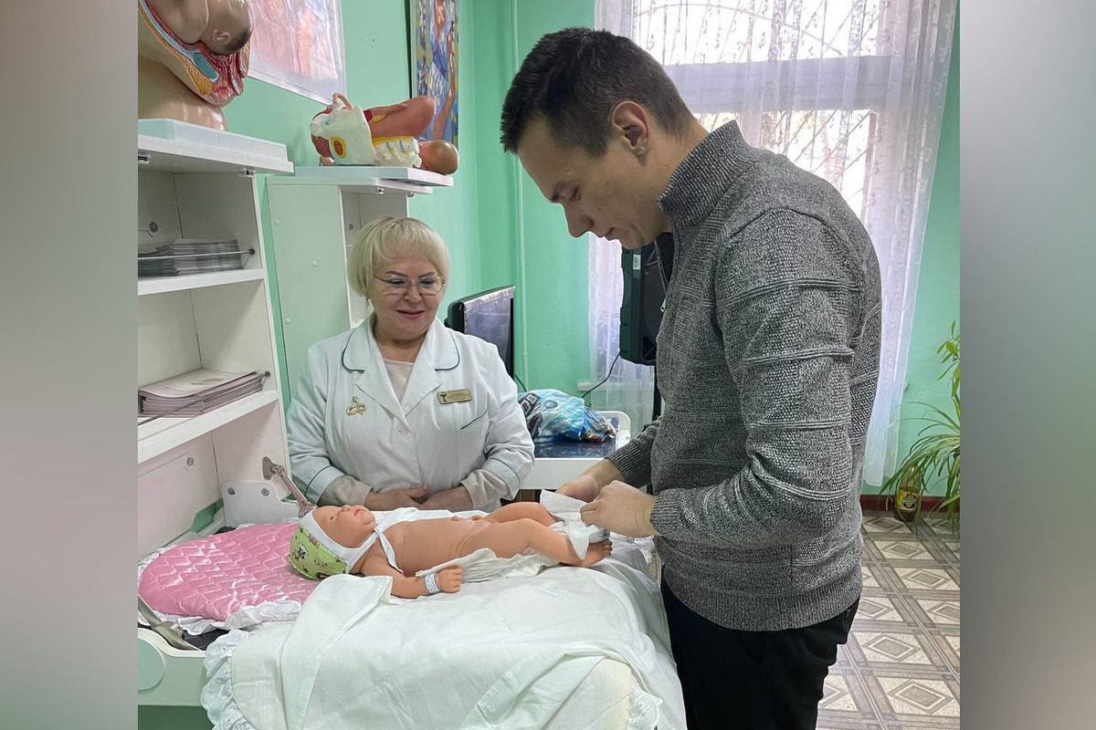 После лекции для будущих пап провели практическое занятие, где они учились ухаживать за новорожденными: пеленать, купать, проводить гигиенические процедуры.