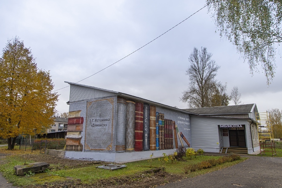Фасад библиотеки в Демянске теперь украшает книжная полка. Создала этот мурал Елена Цуканова из Московской области, а эскиз для него — Андрей Кожуро из Краснодара, сообщается на странице фестиваля уличного искусства «Страницы истории» ВКонтакте.