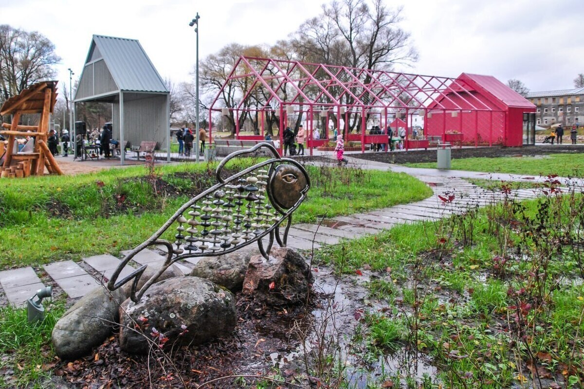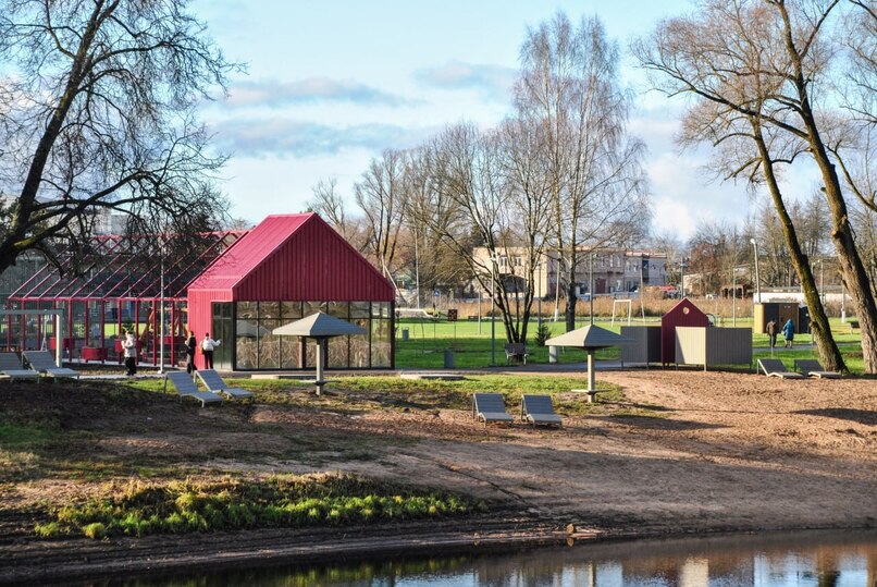 Поближе к воде организовали пляж с шезлонгами, навесами и раздевалками. Набережную украшает теперь открытая оранжерея с уютным павильоном. Также здесь установили арт-объекты, изображающие рыб, и стенд с информацией об истории Введенской стороны Старой Руссы.