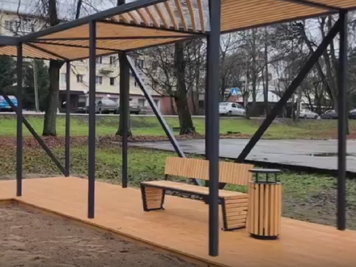 Площадка устроена так, чтобы взрослым, которые привели сюда детей, тоже было удобно. Здесь установлены навесы, которые укроют от дождя и ветра, скамейки, на которых можно отдохнуть, урны для мусора. Предусмотрены заезды для колясок.