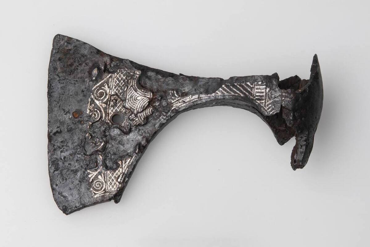 Топор украшен серебряной инкрустацией. Установлено, что для создания шедевра использовано высокопробное серебро с примесями золота и меди, подчеркивая статус владельца. На верхней поверхности топора сохранился фрагмент княжеского символа — один зубец и часть перекладины, что также указывает на то, что оружие принадлежало человеку из высшего круга —князя или знатному дружиннику.