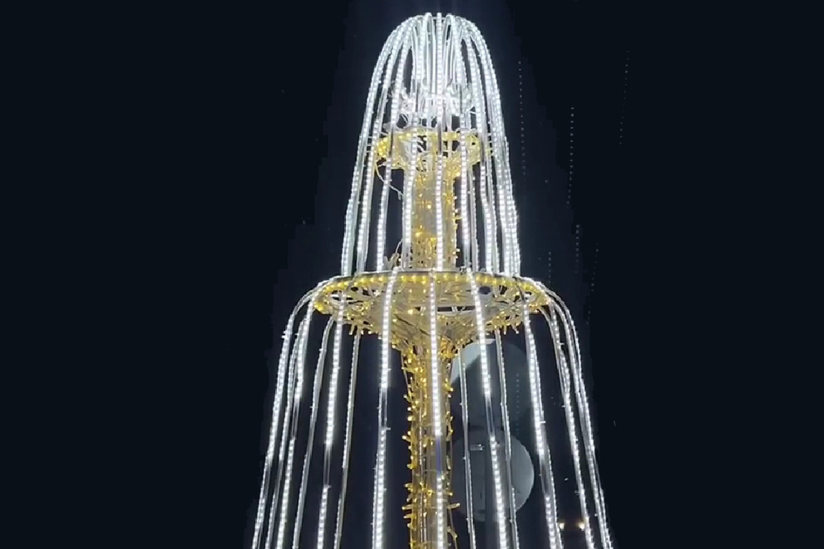 Конструкция из множества переливающихся огоньков очень эффектно смотрится в темноте. С этого объекта началось украшение населенных пунктов округа к новогодним праздникам.