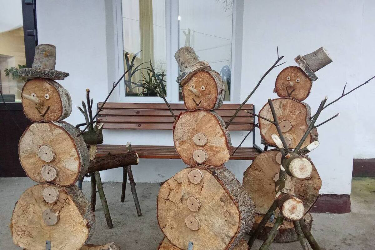 Сотрудники дома культуры сделали настоящий зимний подарок старорусцам. Они изготовили снеговиков из дерева.